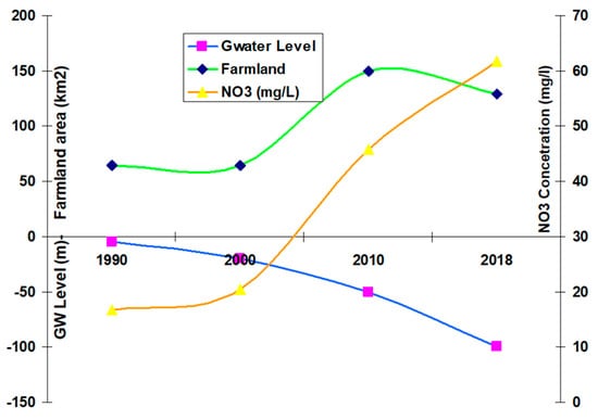 A comparison between the maps of LULC changes and groundwater level and quality suggests a strong spatial correlation between LULC changes and groundwater quality. The rapid changes in LULC have led to the degradation of water quality in the entire region. Degradation of groundwater quality and increased TDS concentration is attributed to the leaching and dissolution of salts that are cemented in the soil, intensive use of fertilizers, and irrigation water return flow from agricultural activity to the shallow aquifer [,]. The estimated return flow is on average 25% of the total amount of groundwater application [,,]. While the irrigation return flow increases the groundwater recharge, it decreases the groundwater quality and increases NO3 concentration. The intensive use of N fertilisers is well recognised by several studies all over the world that have documented a systematic increase in nitrate concentration in the groundwater due to the long-term intensive application of N fertilisers [,,,]. The NO3 is the highest concentration of a commonly recognised contaminant in the groundwater [,].