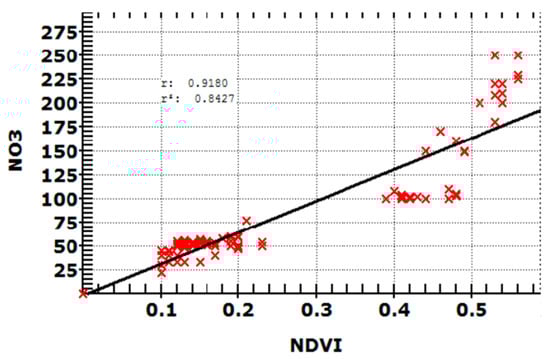 Relationship between NO3 concentration in groundwater and calculated NDVI (r2 = 0.84) based on hydrological information collected from groundwater wells and NDVI calculated from satellite images.