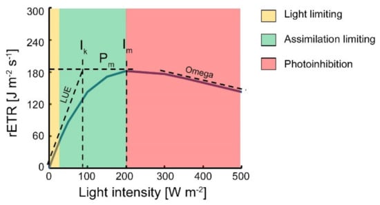Light response curve and its parameterization. rETR refers to relative Electron Transport Rate, LUE—light use efficiency, Pm—maximum rETR, Ik—characteristic intensity, Im—maximum intensity, Omega—stress reaction magnitude. Color code: Light limiting intensity range, carbon assimilation limiting intensity range and photoinhibition limiting intensity range are yellow, green and red colors, respectively.