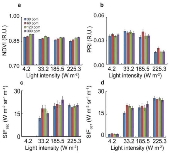 While the overall activity of each SIF wavelength increases with light intensity, it can be seen that the two signals behave differently. SIF760 reaches a plateau at noon while SIF687 increases almost linearly with light. There was only a statistical difference with respect to the changes in light intensity between the extreme points—30 and 300 ppm N. The fluorescence emitted from the photosynthetic reaction centers peaks at the maximal intensity of 684 nm and 740 nm for PSII, and 722 nm for PSI [38]. Therefore, the SIF760 presents both PSII and PSI mixed signals as unequal portions of the fluorescence between PSII and PSI. The PSI’s fluorescence contribution is considered negligible at high light intensities (i.e., noon) (Figure 3c,d) and the SIF687 signal contains mostly PSII with some interference of PSI fluorescence. This ‘plateau’ behavior in SIF760 can be explained as a light quenching. It occurs as more photosystems are recruited to harvest light and perform photosynthesis, when the excited centers of PSI-3P700 and, specifically, P700+, efficiently quench fluorescence [39]. Altogether, there was a similarity between the fluorescence emitted from the various fertilizer treatments in both SIF signals, while the error was greater for SIF760 than SIF687. We suggest that there are several sub-processes which have an impact on the variability of the signal at the 760 nm wavelength, as expected with a photosystems mixed signal. The overall conclusion from this step is that the crops are not found to have visible stress due to the fertilization treatments. NDVI remains constant throughout the measurements if we assume the decline to be the result of the position of the sensor relative to the sun. We also conclude that PRI does not present stress to the crop and the activity of the photosystems depend on light intensity, as expected by the experimental setup of reduced lightning.