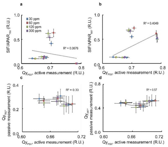 Comparison of remote sensing quantum yield calculations with Pulse Amplitude Modulation (PAM) technique in L. sativa. Panels (a,c) and panels (b,d), represent calculations with SIF760 and SIF687, respectively. Color code of blue, red, green and purple, resembles four fertilization concentrations of 30, 60, 120, and 300 ppm respectively. Each point represents 30 repeats and error bars are standard errors of the mean.