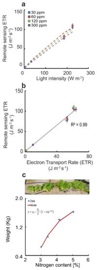 Linear correlation of ETR with the PAM measurements and predictions of plant health and photosynthesis performance. (a) Fertilizer treatments: 30, 60, 120, 300 ppm—color-coded as blue, red, green and purple, respectively (dots seen on the graph, n = 30). The dashed colored lines represent an average of the fit calculated points from Equation (3). (b) Remotely sensed ETR calculation correlated with the ground truth PAM calculation. Error bars represent standard errors of the mean. (c) Final weight of L. sativa measured two weeks after the measurement, at the end of the cultivation period. Error bars represent standard error of the mean, n = 30.