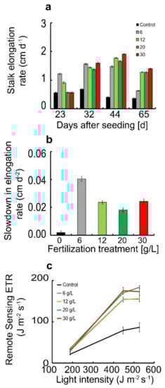 ETR index responds to plant health in Z. mays. (a) Stalk elongation as a proxy for biomass production of Z. mays along a fertilization gradient. Color scheme indicates black, grey, light green, green and red colors which correspond to control (irrigation only), 6, 12, 20 and 30 g of total nitrogen per L of irrigation. n = 5, with 4 technical repeats per each biological repeat and error bars representing standard error of the mean. (b) The change in elongation rate between the 44th and the 65th day. (c) Light response curve of the ETR index at three time instances during the 65th day after sowing. The points are connected in straight lines in order to present the trend of the curve. n = 5, with 4 technical repeats per each biological repeat, and error bars represent standard error of the mean.