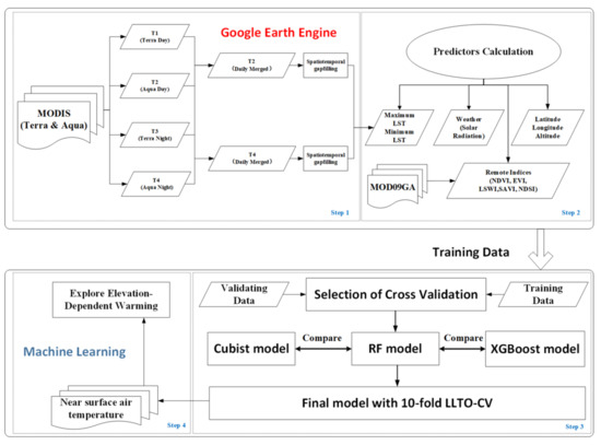 The objectives of this study were to (1) create seamless 1000 m daily MODIS LST datasets using a hybrid method; (2) predict Tair using LST and remotely sensed indices with machine learning; (3) compare the performance of different machine learning methods for estimating maximum, minimum and mean air temperature accordingly; and (4) explore elevation-dependent warming over the TP using decadal temperature datasets.