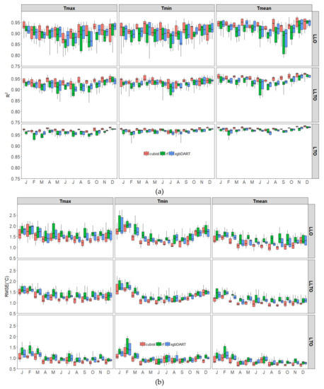 (a) and (b) show the R2 and RMSE for maximum (Tmax), minimum (Tmin) and mean (Tmean) air temperatures using rf, cubist and xgbDART methods based on LLTO-CV, LTO-CV, LLO-CV. The boundaries of box mark the 25th and 75th percentiles; the horizontal black lines within the box indicate the median; the upper and lower whiskers mark the 90th and 10th percentiles.