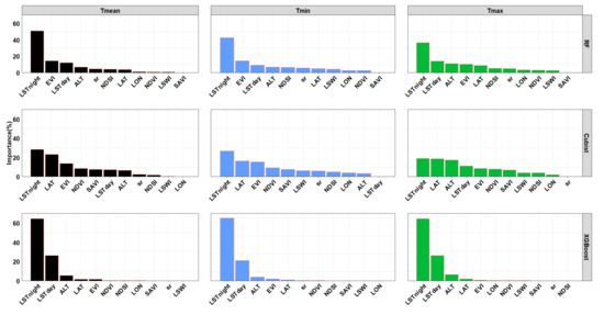 Variable importance for each Tmax, Tmin, and Tmean was determined by different Machine Learning methods based on LLTO-CV (Figure 6). For all properties in all plots, LSTnight explained most of the variable importance. LSTday was identified as being of major importance to the RF and XGBoost, but LSTday within the Cubist variable importance plots had limited influence on Tmax and Tmean, and its importance even dropped to zero in relation to Tmin. Meanwhile, the importance of elevation demonstrated by Cubist became progressively weaker from Tmax to Tmean, and Tmin. In contrast, RF and XGBoost identified elevation as a decisive factor in for temperature estimates. More specifically, elevation occupied the third or the fourth place in terms of importance in the plots of Random Forest, and always ranked in the top three within XGBoost plots. However, for the subplots using XGBoost, there was no clear influence for other variables except LSTday, LSTnight and elevation, where their total importance was higher than 95%. Unlike the XGBoost, other indices in the variable ranking plots demonstrated by Random Forest were also good predictors, while both LSTday and LSTnight showed great ability to improve the air temperature estimates. Therefore, these results revealed that RF had greater explanatory capability for temperature estimates than the other two machine learning methods. Modelled solar radiation, which was a predictor of Tair in complex terrain, also had good explanatory power, i.e., in the top five, within RF. The ranking results of other remotely sensed indices such as EVI and NDSI were as expected; vegetation had a close relationship with temperature, and snow cover change reflected by NDSI was an important indicatod of a warming/cooling climate.