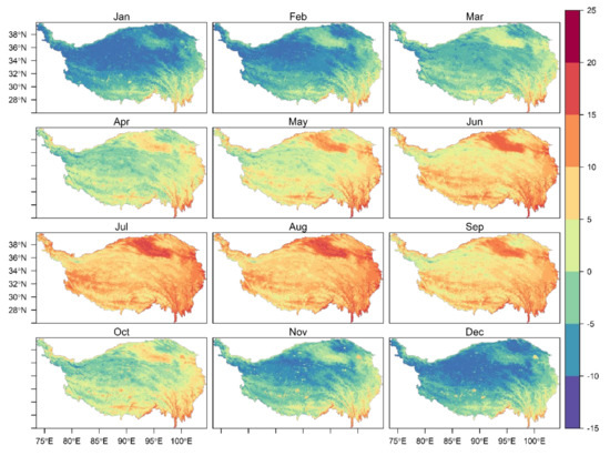 As the monthly time step is more important for many long-term natural resource models, here, we focused on the spatio-temporal characteristics of monthly Tmean in 2003–2013 over the TP using both the station network and our modelling product. Spatially, the range of Tmean was from −15 °C to 20 °C across the TP (Figure 7). The warmest month was July and the coldest was January. Monthly Tmax and Tmin (see in Supplementary Materials Figure S2, Figure S3) generally followed similar spatial patterns; the northwest TP was the coldest area, gradually increasing toward the southeast, showing a stepped distribution. As areas in the south and east of the plateau are covered with lush vegetation and strongly influenced by the monsoon, they are amongst the hottest parts of the plateau. Meanwhile, the south eastern part of the plateau was the warmest, followed by the Qaidam Basin in the northeast, because of its relatively low altitude. In addition, we derived the seasonal mean and annual mean temperatures from the monthly mean temperature over the TP (see in Supplementary Materials Figure S1), with results similar to those of Zhang and Zhang [15].