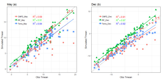 Comparison of monthly Tmean in May (a) and December (b) derived from Random Forest, TerraClimate and CMFD with the observed mean temperature of 1980–2010 from in situ measurements.