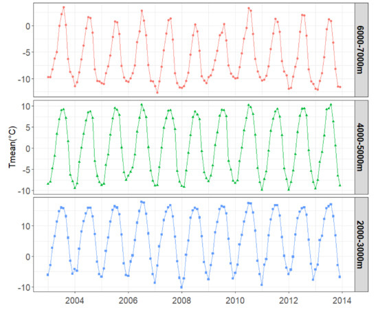 Mean Tair products with the highest accuracy were used to explore the evidence of elevation-dependent warming over TP based on three representative elevation zones: 6000–7000 m, 4000–5000 m, and 2000–3000 m. As shown on Figure 10, in the period from 2003 to 2007, temperature increased in the elevation zones of 2000–3000 m and 4000–5000 m, while temperature decreased at 6000–7000 m. According to the seasonal Mann-Kendall test, only the temperature data in 6000–7000 m (p value = 0.003) showed a significant cooling trend, while the 2000–3000 m (0.37) and 4000–5000 m (0.11) data did not pass the test. In the period from 2003 to 2013, we found that a cooling trend was observed over 6000 m, but that the trends at 2000–3000 m and 4000–5000 m were not significant. Furthermore, when the seasonal Sen’s slope test was used, we found that the magnitude of the trend at 6000–7000 m (slope = −0.09) showed a negative tendency, while 2000–3000 m (slope = 0.02) and 4000–5000 m (0.04) both showed positive trends.