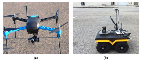 Images of data collection hardware: (a) Image of unmanned aerial vechile (UAV), 3DR Iris quadrotor, on ground before takeoff [35]. (b) Image of unmanned ground vehicle, Jackal by Clearpath robotics.