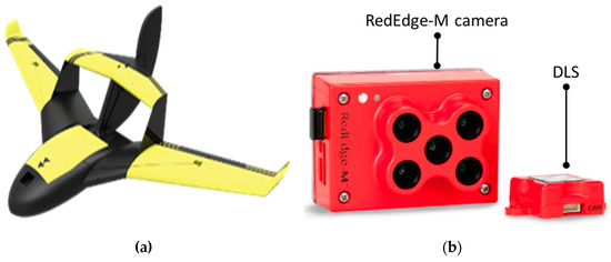 A fixed-wing UAV (Figure 2a) was used for the experiment, equipped with a RedEdge-M camera installed onboard (Figure 2b). The camera captures images in five spectral bands: blue, green, red, red-edge, and near-infrared. It also has an irradiance sensor, a downwelling light sensor (DLS), for radiometric calibration. The measured irradiance from the DLS was used to produce validation data for this study.