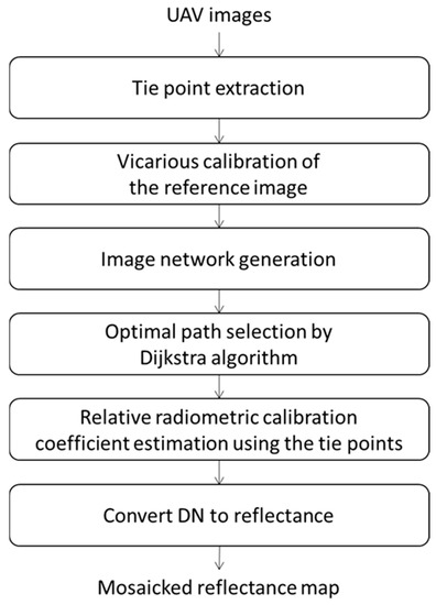 This section explains the procedure for relative radiometric calibration of UAV images based on tie points and the minimum distance path method. Figure 5 summarizes the procedure. First, tie points were extracted automatically from UAV images through structure from motion (SfM)-based geometric processing [32,33,34]. Commercial SW or open-source SW can be used for this process. In this study, Pix4D mapper 4.1 was used to extract tie points. Secondly, the image with ground reference panels was selected as the reference image. DN values of the targets within the reference image were measured and coefficients for vicarious calibration were estimated through regression analysis.