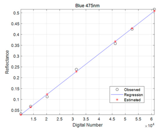 An examples of linear regression analysis between the digital number and the reflectance for blue band needed to estimate vicarious calibration coefficients ( and ) of a reference image.