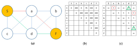 (a) An image network in an area, and the two shortest paths from image S to F (red and green lines); (b) the number of tie points between each image pair, and (c) the weight of the image pairs and the two shortest paths (red circles and green triangles).