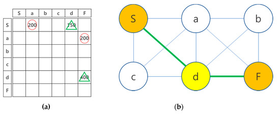(a) Number of tie points in the two shortest paths and (b) selected optimal path from S to F (green line).