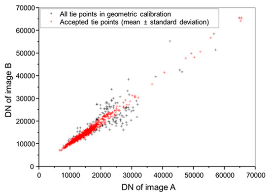 An example of the distribution of digital number (DN) values for all tie points (black crosses) and accepted tie points (red crosses).
