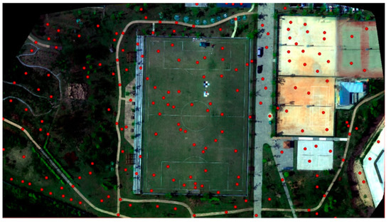 For validation, a mosaicked image (a reference reflectance map) was generated separately using irradiance measurements. For quantitative validation, reflectance obtained from relative radiometric calibration was compared to the validation data at the same points. The test samples were collected for a total of 200 pixels by random sampling (Figure 12). Error was calculated as root mean square error (RMSE) using the following equation:
