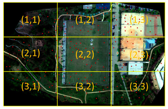 The whole mosaicked image was divided into 3 × 3 subregions (Figure 14) and average EVs for each subregion are listed in Table 3. As shown in the table, EVs of the left subregions are higher than other subregions. The UAV images of some subregions were taken brighter than other subregions. Therefore, the mosaicked image from NoRC on those subregions appears brighter than the validation data. From visual inspection and an analysis of EV, the results from the proposed RCOP provided better performance than the other methods.