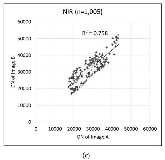 Distribution of DNs for an image pair in (a) red, (b) red-edge, and (c) NIR bands.