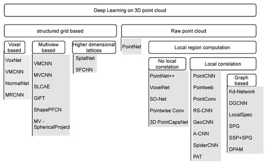 In the past, the processing of point clouds for visual intelligence has been based on handcrafted features [,,,,,]. A review of handcrafted-based feature learning techniques is conducted in []. The handcrafted features do not require large training data and have been seldom used due to insufficient point cloud data; furthermore, deep learning was not popular. However, with the increasing availability of acquisition devices, point cloud data are now readily available, making the use of deep learning for its processing feasible.