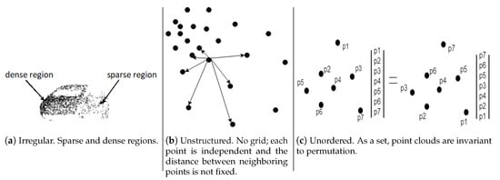 Applying deep learning to 3D point cloud data has many challenges. These challenges include occlusion, which is caused by cluttered scenes or blindsides; noise/outliers, which are unintended points; and point misalignment, etc. [,]. However, the most significant challenges regarding the application of deep learning to point clouds can be categorized as follows: