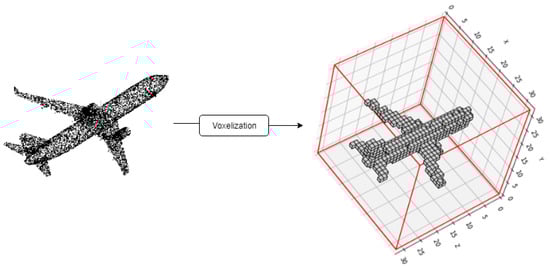 The point cloud of an airplane is voxelized to a volumetric occupancy grid.