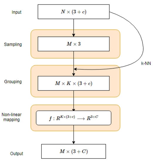 Regarding the non-linear mapping function, once the nearest points to each representative point are obtained, the next step is to map them into a feature vector that represents the local structure. In grid convolution, the receptive field is mapped into a feature neuron using simple matrix multiplication and summation with convolutional kernels. This is not easy in point clouds, because the points are not structured; therefore, most approaches approximate the function using a PointNet-based method [] which is composed of multilayer perceptrons, , and a maxpooling symmetric function, , as shown in Equation (1).