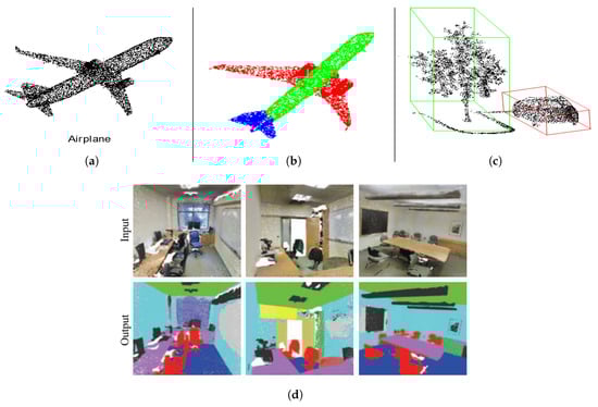 A point cloud is simply a set of data points in space. The point cloud of a scene is the set of 3D points around the surfaces of the objects in the scene. In its simplest form, 3D point cloud data are represented by the XYZ coordinates of the points, or these may include additional features such as surface normals and RGB values. Point cloud data represent a very convenient format for representing the 3D world. Point clouds are commonly used as a data format in several disciplines such as geomatics/surveying (mobile mapping); architecture, engineering, and construction (AEC); and Building Information Modelling (BIM) [,,]. Point clouds have a range of applications in different areas such as robotics [], autonomous driving [], augmented and virtual reality [], manufacturing and building rendering [], etc.