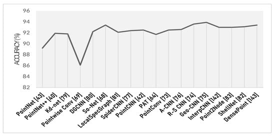 Table 1 summarizes the approaches, showing their sampling, grouping, and mapping functions. The methods employ local region computation based on sampling and grouping; PointNet is an exception. In [,,], the authors do not use the sampling technique, and as such, these methods are more computationally intensive. To improve discriminative ability, several methods have exploited the correlation between points in a local region. By default, graph-based methods capture the correlation between the points using edges. Point2Node [] exploits not only the local correlation but also the non-local correlation between points and has better performance in terms semantic segmentation. The performance of the methods discussed in classification, segmentation, and object detection applications are shown in Section 7.