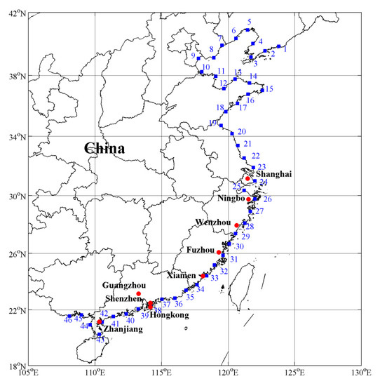 Locations of coastal stations (blue box) and 9 coastal cities (red dots) along China coastline.