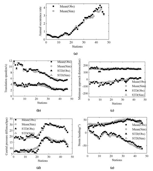 To validate the empirical track model, we compare the mean and standard values of typhoon key parameters between the simulated and historical tracks along the China coastline, including typhoon annual occurrence rate, λ: translation speed, VT: central pressure difference, Δp: minimum approach distance, Dmin: storm heading, θ. λ is the frequency of typhoons within a subregion of one interest site. Δp is central pressure difference from periphery pressure. When the interest site is on the right of the typhoon track, Dmin is positive, and vice versa. θ is the angle of typhoon moving direction from the true north. First, we use the simplified empirical tracking model to construct 1000-year synthetic typhoons in the Northwest Pacific Basin, based on the statistical characteristics of observed typhoons from CMA-STI data. Then, we select 46 coastal stations of China (shown in Figure 1), and extract the key parameters of typhoons that pass within 250 km of each coastal station from the simulated and CMA-STI typhoon data, respectively. Finally, typhoon central pressure difference is estimated by the maximum value of each typhoon within 250 km from the coastal station. Other typhoon key parameters are estimated when a typhoon is closest to each station.