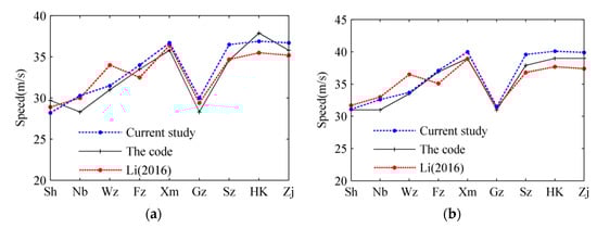 Comparisons of wind speeds for the (a) 50-year and (b) 100-year return period at 9 cities between the current study, the design code [45], and Li and Hong [15].