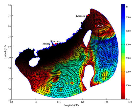 The use of an unstructured grid of the SWAN+ADCIRC model can make the model have higher resolution in areas where the water depth changes dramatically and the shoreline is complex, and coarser resolution in places where the topography is relatively flat, which can not only meet the requirements of the calculation, but also save the calculation time (Blain et al. [46]). The grid resolution in this study ranges from 50 km in the open sea, to as high as 400 m around Shenzhen City (Figure 4). The ETOPO1 database is used for the bathymetric data. The driven wind field is calculated from the YM model.
