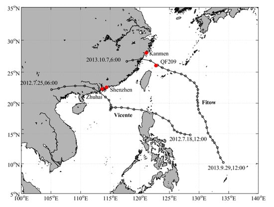 Tracks of typhoon Vicente (1208) and Fitow (1312) and locations of meteorological stations.