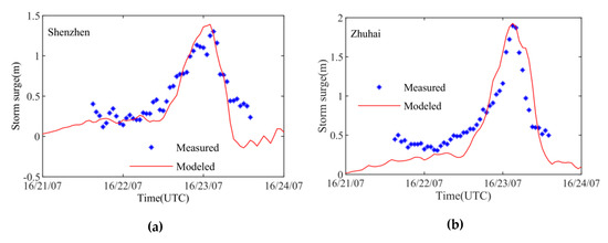 Comparison of SWAN+ADCIRC modeled and measured storm surge at (a) Shenzhen and (b) Zhuhai for the typhoon Vicente (Time: hour/day/month).