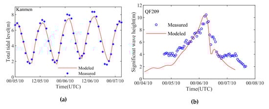 Comparison of SWAN+ADCIRC modeled and measured (a) total tidal level at Kanmen and (b) significant wave height at QF209 for the typhoon Fitow (Time: hour/day/month).