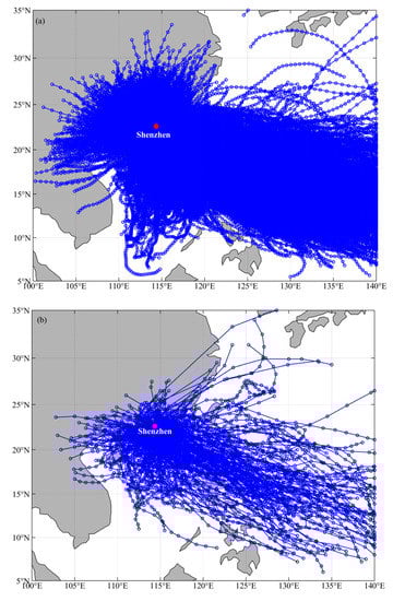 (a) Simulated and (b) observed tracks of all typhoons affecting Shenzhen City.