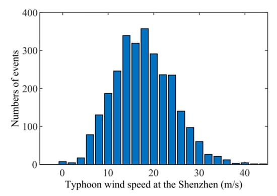 Using the empirical tracking model, we generate 32,689 virtual typhoons during the 1000-year period in the Northwest Pacific Basin. From those typhoons, we extract 2811 typhoon tracks that approach within 250 km from the Shenzhen City as shown in Figure 9a. Based on the historical typhoon data from 1949 to 2017 obtained by CMA through satellite cloud map and meteorological radar, we extract 180 observed typhoons affecting Shenzhen, as shown in Figure 9b. The annual occurrence rate of virtual typhoons for Shenzhen is 2.811 and that of the observed typhoons is 2.623. The error of the annual occurrence rate between the modeled and the observed is 7%.