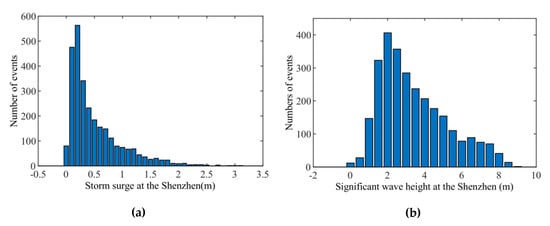 We use the SWAN+ADCIRC coupled model to calculate the wave heights and storm surges of 2811 simulated typhoons for Shenzhen City (114.338°E, 22.597°N). The histograms of the maximum values of storm surges and SWHs are shown in Figure 12a,b. The peak of storm surge in Figure 12a is about 0.2 m and, as the storm surge level increases, the frequency of storms decreases rapidly. The upper tail on the right-hand side is up to 3 m. This distribution is typically heavy tailed. The histogram of SWHs in Figure 12b peaks at about 2 m and, as the SWH increases, the frequency of storms decreases slowly. This distribution has a moderately heavy tail.