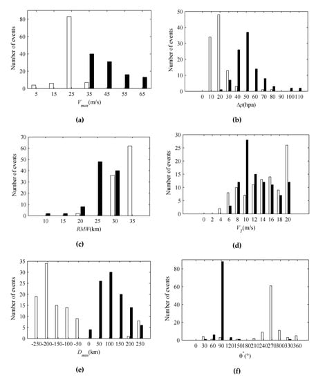 The storm surge is caused by a typhoon; thus, it is closely related to the typhoon characteristics, especially when the typhoon is closest to a site. In order to study the impact of typhoon characteristics on the extreme storm surges for Shenzhen City, we compare the key parameters between 100 typhoons with the highest storm surge and the 100 typhoons with the lowest storm surge, referring to Lin et al. [8]. The histograms of the key parameters of 100 typhoons with the highest storm surge are represented by solid bar and that of the 100 typhoons with the lowest storm surge are represented by hollow bar, as shown in Figure 13. All key parameters except the maximum wind speed are the statistical values when the typhoon is closest to the Shenzhen site. In Figure 13, Vmax represents the maximum value of typhoon wind speed; Δp is the central pressure difference; VT is the typhoon translation speed; RMW is the radius to maximum winds; Dmin is the minimum approach distance between the typhoon and the Shenzhen site, and is positive when the Shenzhen site is located to the right of the typhoon track; θ″ is the angle between the storm heading and direction from the site to storm (when a site is on the right side of typhoon track, θ″ greater than 0 and less than 180°, and conversely, θ″ greater than 180° and less than 360°).