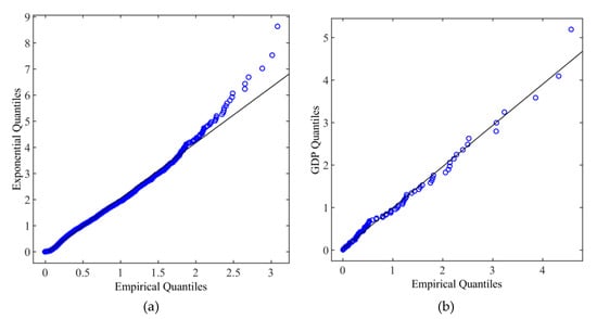 Q-Q plot between the empirical distribution of significant wave height and (a) a standard exponential distribution, (b) generalized Pareto distribution at a threshold of 7.4 m.