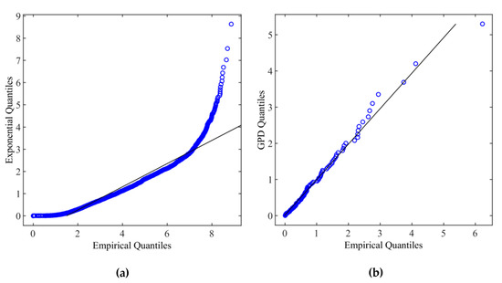 A quantile-quantile (Q-Q) plot between the empirical distribution of maximum wind speed and (a) a standard exponential distribution, (b) generalized Pareto distribution at a threshold of 30 m/s.