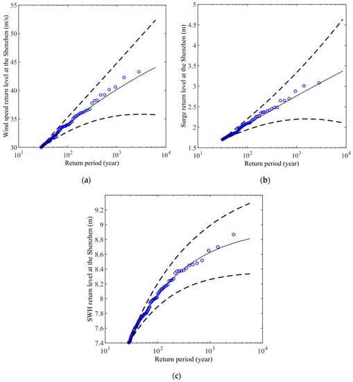 Figure 17a–c show the obtained return periods of the peak wind speeds, maximum storm surges, and maximum SWHs, respectively, for the Shenzhen site and the 95% confidence limits are also shown. From Figure 17, we can easily obtain the design value of wind speed, storm surge, or SWH for different return periods, which can provide reference for disaster prevention and mitigation in Shenzhen City.