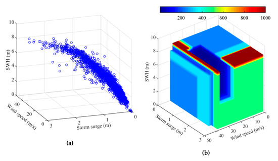 Based on the simulated data for Shenzhen City, we give the scatter distribution of the peak wind speeds, maximum storm surge, and the maximum SWHs as shown in Figure 18a. We also give the three-dimensional joint MRP isosurface plots, as shown in Figure 18b. The different colors in Figure 18b represent different MRP values, and the hole in Figure 18b is meant to see clearly the inside. Based on the hazard plots, we can obtain the joint hazards design values of typhoon wind, surge, and wave for different return period within Shenzhen City.