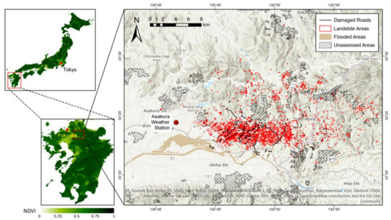 Map of study area encompassing the eastern part of Asakura-shi, Fukuoka and the northern part of Hita-shi, Oita, Japan. The vector layer delineating landslide areas, damaged roads, and flooded areas along with unassessed areas was obtained from the Geospatial Information Authority of Japan (GSI) [24] (see Section 2.3). The Himawari-8 AHI smoothed and gap-filled NDVI image of 21 June 2017 was used in the upper-left and lower-left frames. The coastline vector dataset used in those two frames was obtained from the GSI [25]. The map was created with ArcGIS® software (ArcGIS® Pro 2.4.1, Esri, Redlands, CA, USA, http://www.esri.com).