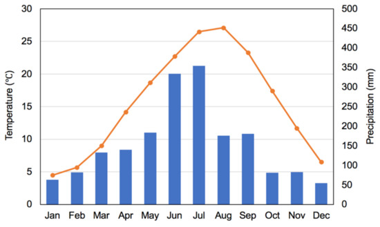 Our study area was located on a mountainous region that encompassed the eastern part of Asakura-shi, Fukuoka Prefecture and the northern part of Hita-shi, Oita Prefecture on the northern Kyushu in Japan (Figure 1). The topography of the study area is variable, ranging from 50 to 600 m in elevation [23]. The region is in the warm temperate climate zone. Monthly mean temperatures range from 4.5 °C in January to 27.1 °C in August, whereas the lowest and highest monthly rainfall amounts are 54.4 mm in December and 354.1 mm in July (Figure 2), based on 30 year measurements (1981 to 2010) at the Asakura weather station (33°24.4′N, 130°41.7′E, 38 m ASL) of the Automated Meteorological Data Assimilation System (AMeDAS).
