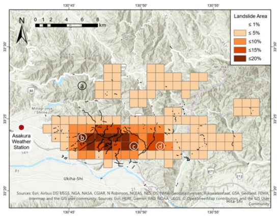Percent landslide areas derived from the landslide polygon dataset. The damaged roads [24] are shown as black lines for reference. The circled letters (a, b, c, and d) correspond to the locations where AHI NDVI temporal signatures in the next figure (Figure 4) were extracted. The map was created with ArcGIS® software (ArcGIS® Pro 2.4.1, Esri, Redlands, CA, USA, http://www.esri.com).