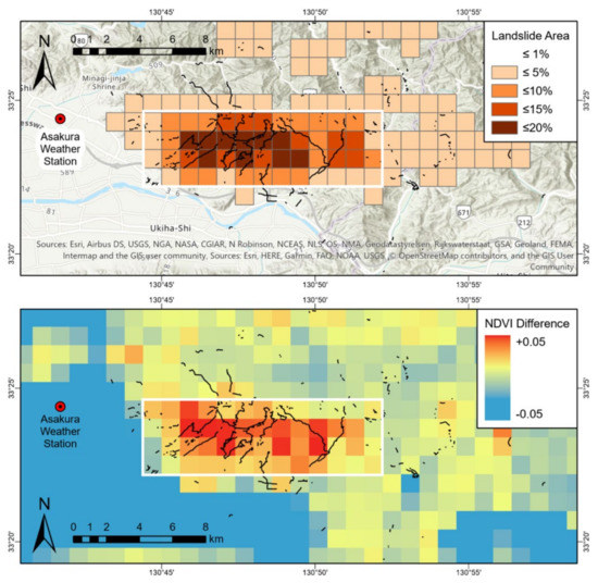 ΔNDVI (bottom) compared to percent landslide areas (top). The white line boxes on the maps represent the region used for subsequent correlative analysis (see the text and Figure 6). The damaged roads [24] are shown as black lines for reference. The map was created with ArcGIS® software (ArcGIS® Pro 2.4.1, Esri, Redlands, CA, USA, http://www.esri.com).