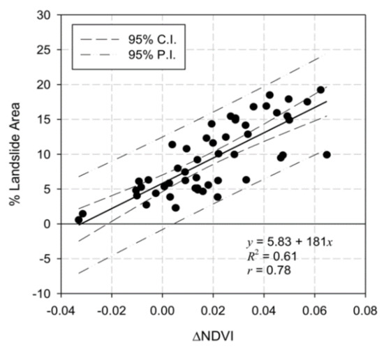 Using the observation pairs in the boxed region in Figure 5, the percent landslide area was regressed against ΔNDVI with a simple linear model. The relationship was statistically significant (p-value < 0.01, R2 = 0.61, and r = 0.78) (Figure 6). The regression results (the 95% prediction interval) indicated that, for a pixel with ΔNDVI greater than 0.005, we could be 95% confident that landslides occurred on that pixel and the areas impacted by landslides were ~7% on average (Figure 6).