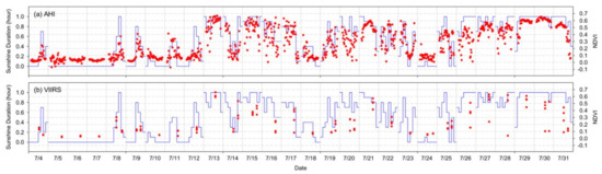 Plotted in Figure 7b are VIIRS NDVI values extracted over a 2 pixel by 2 pixel window corresponding to the AHI NDVI extraction location (i.e., four pixels). As a wide-swath sensor in near-polar sun-synchronous orbit, VIIRS acquired one or two observations per day. Based on the NDVI values supported by the sunshine duration data, VIIRS also acquired the first clear-sky observations on 13 July and all of the four pixel observations were cloud-free. The next clear-sky observations were acquired on 27, 28, and 29 July where two, one, and one observations out of the four were cloud-free, respectively (Figure 7b). In contrast to AHI, no cloud-free observations were acquired with VIIRS on 15, 21, and 30 July.